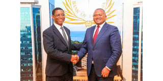 The Governor of the Bank of Tanzania (BoT), Emmanuel Tutuba (left), shares a light moment with CRDB Bank Group CEO, Abdulmajid Nsekela, during a meeting held yesterday to discuss the implementation of the bank’s core banking system. PHOTO | THE CITIZEN CORRESPONDENT