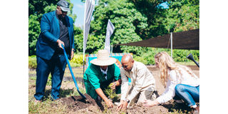 NCBA acting managing director Alex Mziray (left), founder and executive director of Kijani Pamoja, Sarah Scott (right) and Arumeru District Commissioner Ahmed Mwinyi (second right) plant trees at Olkokola on the western slopes of Mt Meru yesterday. PHOTO | COURTESY