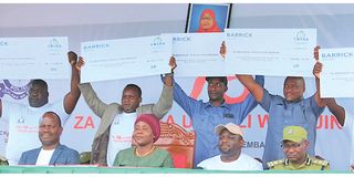 Chairpersons of the villages of Kewanja, Kerende, Genkuru, Nyamwaga and Nyangoto during one of the occasions last year when they received royalty dividends from the Barrick North Mara Gold Mine. PHOTO|THE CITIZEN CORRESPONDENT