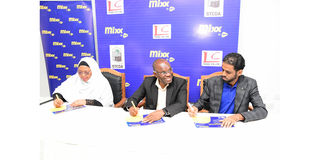 The Director General of the Stone Town Conservation and Development Authority (STCDA), Mr Ali Said Bakar (centre), the Commercial Manager for Mixx – Zanzibar, Mr Salum Nassor Mohamed (right), and the Director of Osaju Company Ltd, Ms Farida Said Uledi (left), sign a memorandum of understanding to roll out a digital parking payment system within the Stone Town Conservation Area. PHOTO | COURTESY