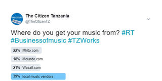 Today Tanzanian music is distributed in digital platforms through Blogs, Apps and Websites like Mkito.com, Mdundo, Mziiki, Wasafi.com, Beka Boy, Yinga media and DJ Mwanga.