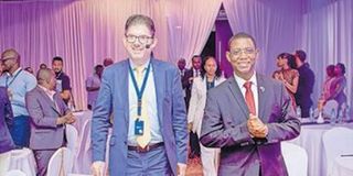 Bank of Tanzania governor Emmanuel Tutuba (right) with Visa’s head of Southern and East Africa Michael Berner arrive at the launch of the office in Dar es Salaam yesterday. PHOTO | CORRESPONDENT