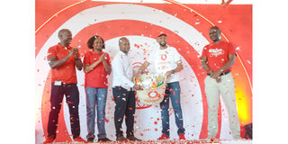 Vodacom Tanzania Plc Chief Executive Office, Philip Besiimire (second right), presents a holiday gift basket to journalist Halfan Chusi (third left) as a gesture of appreciation as the company launched holiday season campaign. The event was witnessed by Vodacom Tanzania’s M-Pesa director, Epimack Mbeteni (right), Vodacom Tanzania Plc Customer Business Unit director, Brigita Stehen (second left) and Vodacom Business director, Nguvu Kamando (left), in Dar es Salaam. PHOTO | COURTESY