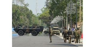 Soldiers patrol in front of the headquarters of Benin's radio and television station, after, according to Benin's Interior Minister, the country's armed forces thwarted the attempted coup against the government of Benin's President Patrice Talon, in Cotonou, Benin, December 7, 2025.