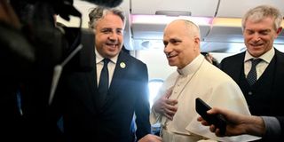 Pope Leo XIV addresses journalists during the flight heading to Algiers on April 13, 2026. Pope Leo XIV embarks today on an 11-day visit to Algeria, Cameroon, Angola and Equatorial Guinea for his first major international trip since becoming pontiff last year. PHOTO | REUTERS