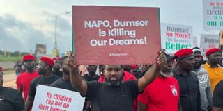 The protesters wielded signs with slogans such as "NPP, you've failed the youth," "No light, no progress," and "Electricity is a right, not a privilege."