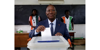 President of Ivory Coast Alassane Dramane Ouattara of the RDR (Rally of Republicans) party casts his ballot during the country's municipal and regional elections in Abidjan, Ivory Coast, October 13, 2018.