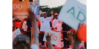 Ivorian President Alassane Ouattara, 83, waves at supporters during a final political rally ahead of Ivory Coast's presidential election, scheduled for October 25, in Abidjan, Ivory Coast, October 23, 2025.