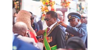 Zimbabwean President Emmerson Mnangagwa (centre) is decorated after being sworn in as President during an inauguration ceremony in Harare on September 4, 2023. AFP