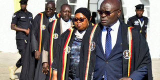 Uganda's Electoral Commission (EC) commissioners, led by chairman Simon Byabakama, walk after announcing initial results at the Tally Centre in Lubowa, Wakiso district near Kampala, Uganda January 16, 2026. PHOTO/REUTERS