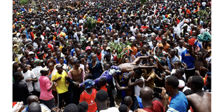 A crowd carries a mourner who fainted during a stampede at the funeral service for former Kenyan Prime Minister Raila Odinga, at the Jomo Kenyatta Stadium in Mamboleo, in Kisumu County, Kenya, October 18, 2025.