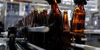 An employee arranges beer bottles on a conveyor belt along a production line at the East African Breweries' microbrewery as the company released its half-year results in Ruaraka, Nairobi, Kenya, January 26, 2024. PHOTO | REUTERS
