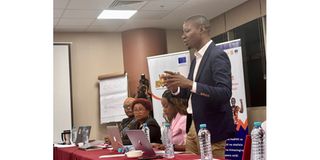 Programme manager for the Vijana at Work project Mandolin Kahindi speaking during the stakeholders meeting to amplify women voices in climate solutions. PHOTO | COURTESY