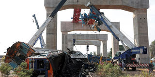 The elevated high-speed rail project, one of several under construction in Thailand, was being built above the existing rail line. Part of the collapsed crane is still propped up by the stanchions built to support the new rail link.