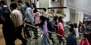 People walk in the subway as the Outcome of the Seventh National Population Census by the National Bureau of Statistics of China, are released during the State Council Information Office (SCIO) in Beijing on May 11, 2021.