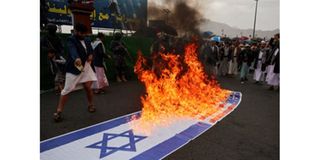 Houthi activists burn US and Israeli flags during a demonstration in solidarity with Iran and Lebanon, amid the US-Israeli conflict with Iran, in Sanaa, Yemen March 6, 2026.
