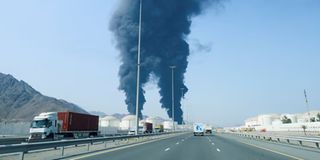 Smoke rises in the Fujairah oil industry zone, caused by debris after interception of a drone by air defenses, according to the Fujairah media office, amid the U.S.-Israel conflict with Iran, in Fujairah, United Arab Emirates, March 14, 2026. PHOTO | REUTERS