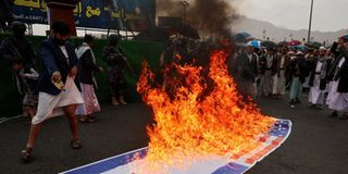 Houthi activists burn U.S. and Israeli flags during a demonstration in solidarity with Iran and Lebanon, amid the U.S.-Israeli conflict with Iran, in Sanaa, Yemen March 6, 2026. PHOTO | REUTERS