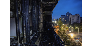 The charred balcony of an apartment in a building that was set ablaze during Russian drone and missile strikes on the capital, amid Russia's attack on Ukraine, in Kyiv, Ukraine October 10, 2025.