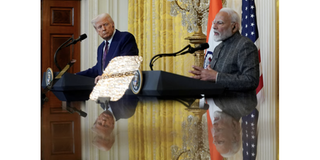 U.S. President Donald Trump and Indian Prime Minister Narendra Modi are pictured in a mirror as they attend a joint press conference at the White House in Washington, D.C., U.S., February 13, 2025.