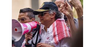 Colombian President Gustavo Petro addresses pro-Palestinian demonstrators at Dag Hammarskjold Plaza outside UN headquarters during the 80th United Nations General Assembly in New York City, US, September 26, 2025