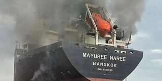 A handout photo taken on March 11, 2026 and released by the Royal Thai Navy shows smoke rising from the Thai bulk carrier 'Mayuree Naree' near the Strait of Hormuz after an attack. PHOTO | COURTESY