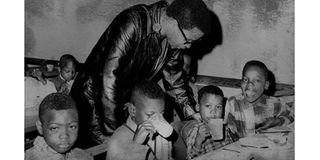 1969: Pete O’Neal chats with children eating a free breakfast provided by the Black Panthers.