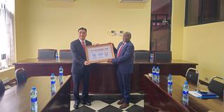 Ardhi University Vice-Chancellor Prof Evaristo Liwa receives a photograph from the Chongqing Vocational Institute of Engineering of China Vice-President and President symbolising the commencement of Luban Workshop training at the campus during an event held in Dar es Salaam recently. PHOTO | COURTESY