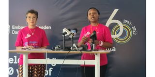 Gloria Kida the founder and chief executive officer of the Shujaa Cancer Foundation (right) speaking at the press conference. Next to her is the Ambassador of Sweden in Tanzania, Charlotta Ozaki Macias.