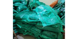 Some of the empty fertiliser sacks seized by Njombe regional police in Makambako Town, which were being used to package a different type of fertiliser under the original sack branding. PHOTO|SEIF JUMANNE