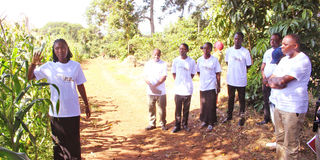 Director of Corporate Relations at Serengeti Breweries Limited, John Wanyancha (right), listens to a beneficiary of the Kilimo Viwanda Programme (left) during a farm visit at Kilacha Wazazi College in Moshi. PHOTO | COURTESY