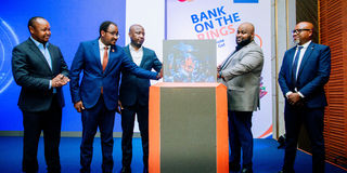 NMB Bank’s Chief of Retail Banking, Mr Filbert Mponzi (centre), NMB’s Director of Investor Relations, Sustainability and Corporate Communications, Mr Innocent Yonazi (second left), and Mastercard Tanzania Country Manager, Mr Moses Alphonce (second right), launch the new NMB TAP payment solution, which enables customers to make payments using rings, stickers and bracelets, at an event held in Dar es Salaam. On the left is NMB Dar es Salaam Zone Manager, Ms Seka Urio, and on the right is NMB Senior Manager – Card Business, Mr Manfred Kayala. PHOTO/COURTESY