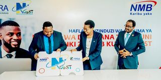 From left: Director general of the Public Procurement Regulatory Authority, Dennis Simba (left), NMB Bank chief executiveofficer, Ruth Zaipuna, and NMB director of Investor Relations, Sustainability and Communications, Innocent Yonazi (right) launch the Digital Bank Guarantee service integrated with the National e-Procurement System of Tanzania in Dar es Salaam yesterday. PHOTO | THE CITIZEN CORRESPONDENT