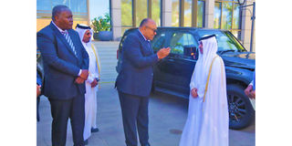 The minister for Foreign Affairs and East African Cooperation, Mahmoud Thabit Kombo (centre), expresses gratitude to the Ambassador of Qatar to Tanzania, Fahad Rashid Al-Muriki (second right), after receiving new vehicles donated by the State of Qatar to the ministry in Dar es Salaam yesterday. PHOTO | MICHAEL MATEMANGA