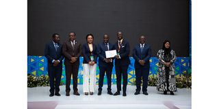 Deputy Prime Minister Doto Biteko, presenting a Certificate of Appreciation to the Chief Executive Officer of Stanbic Bank Tanzania, Manzi Rwegasira, for sponsoring the Chairpersons and CEOs Forum for Public Institutions, shortly after closing the conference held in Arusha.