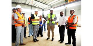 Minister for Energy, Deogratius Ndejembi (third from right), speaks while inspecting the construction project of a concrete pole manufacturing plant in Mapambano Ward, Tabora Municipality.