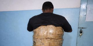 A suspect who was intercepted and found with bags of a narcotic dug wrapped around his body and hidden with an extra layer of clothing. PHOTO | COURTESY