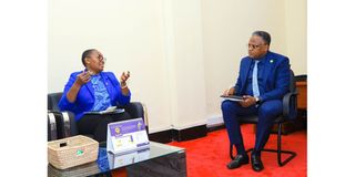 Permanent Secretary in the Prime Minister’s Office (Policy, Parliament, and Coordination), Dr Jim James Yonazi (right), listens to the NEMC Director General, Dr Immaculate Sware Semesi, during their meeting on Wednesday, 30 April 2025. PHOTO | COURTESY
