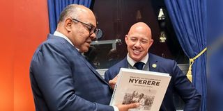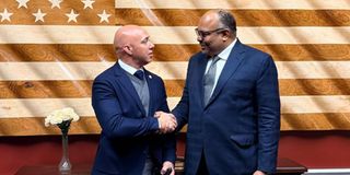 Minister for Foreign Affairs and East African Cooperation, Mr Mahmoud Thabit Kombo (left), with the Chairman of the United States House Foreign Affairs Committee and Republican Congressman for Florida, Mr Brian Mast. PHOTO | COURTESY OF THE MINISTRY OF FOREIGN AFFAIRS AND EAST AFRICAN COOPERATION