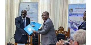 Aerotechnics Limited Chairman Jared Ajwang'a (left) and National Institute of Transport (NIT) Rector Dr Prosper Mgaya (right) exchange documents after signing a Memorandum of Understanding. PHOTO/COURTESY.