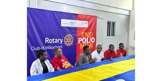 President of the Rotary Club of Mikocheni, Mr Nasibu Mahinya speaks in Dar es Salaam on Friday. From left is President of the Rotaract Club of Alpha, Dr Aniita Semfilinge, National PolioPlus Coordinator from Rotary International, Dr William Mwenge, Rotaract Club of Bahari Youth President, Mr Sudi Kondo, Rotaract Club of Young Professionals member, Mr Falles John Tagaya and Rotaract Club of Young Professionals, Ms Gloria Mwankenja; her KIUT counterpart, Ms Eunice Sylvestre. PHOTO|THE CITIZEN CORRESPONDENT