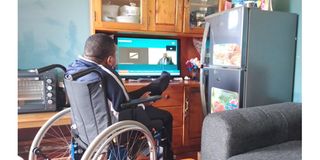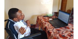 Mr Zawadi Msigalla types on a laptop using his leg. PHOTO | FRIDAY SIMBAYA