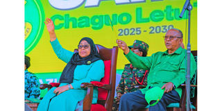 CCM Union presidential candidate Samia Suluhu Hassan and Retired Prime Minister Frederick Sumaye attend yesterday’s campaign rally in Same District, Kilimanjaro Region. PHOTO | COURTESY