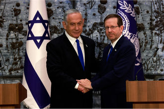 Israel's President Isaac Herzog (R) and Likud party Chairman Benjamin Netanyahu pose for a photograph after the former tasked the latter with forming a new government, in Jerusalem, on November 13, 2022. Hezog formally designated Benjamin Netanyahu to form a government, a victory for the former veteran prime minister who had vowed to return to power.