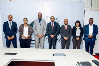 Managing director of Mwananchi Communications Limited (MCL), Bakari Machumu (left), and managing director of the National Insurance Corporation of Tanzania Ltd. (NIC), Dr Elirehema Doriye, shake hands as a sign of cooperation between the two companies after signing a commercial relations agreement in Dar es Salaam on October 19, 2023.