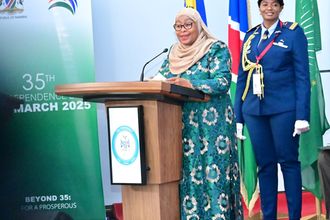 President Samia Suluhu Hassan addresses various leaders during the swearing-in ceremony of Namibian President-elect, Netumbo Nandi-Ndaitwah, on March 21, 2025, at the Namibian State House in Windhoek. PHOTO | STATE HOUSE