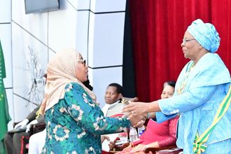 President Samia Suluhu Hassan congratulates Namibia's President Netumbo Nandi-Ndaitwah after delivering a speech at her inauguration ceremony held at the State House in Windhoek on March 21, 2025. PHOTO | STATE HOUSE