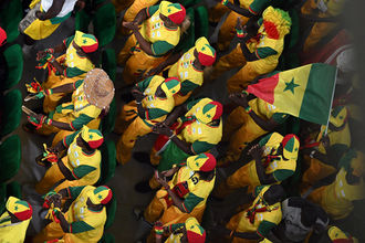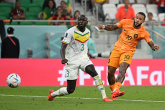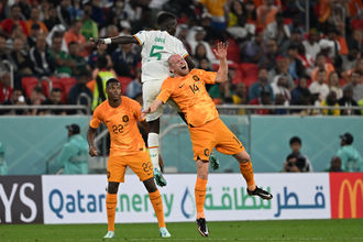 Senegal's midfielder #05 Idrissa Gana Gueye jumps for the ball ahead of Netherlands' defender #22 Denzel Dumfries (L) and Netherlands' midfielder #14 Davy Klaassen during the Qatar 2022 World Cup Group A football match between Senegal and the Netherlands at the Al-Thumama Stadium in Doha on November 21, 2022.