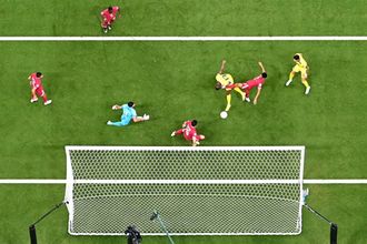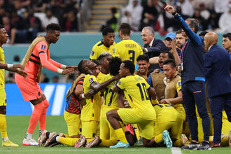 Ecuador's forward #13 Enner Valencia (center R) heads the ball into the net but the goal was disallowed during the Qatar 2022 World Cup Group A football match between Qatar and Ecuador at the Al-Bayt Stadium in Al Khor, north of Doha, on November 20, 2022.