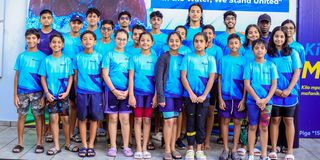 The male swimmers are Burhanuddin Hatim, Azaan Momin, Adam Hassanali, Burhanuddin Abdulkadir, Hassan Harunani, Ridha Sharif, Shuneal Bharwani and Burhanuddin Mustansir.